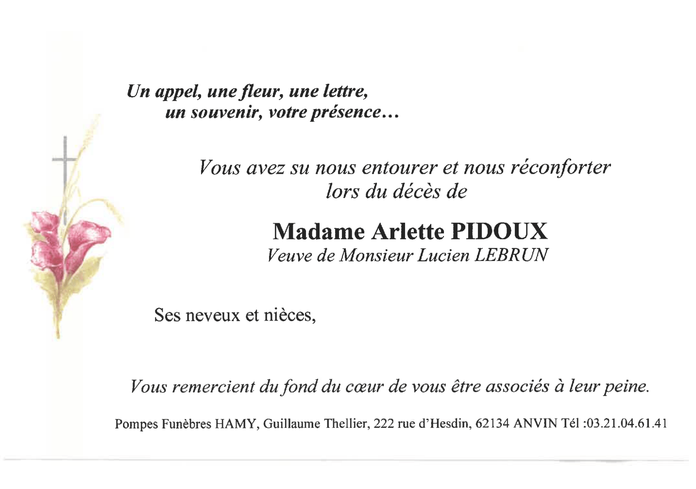 Du fond du cœur, nous vous disons merci. A vous qui, par votre présence, vos fleurs, vos pensées, et par vos écrits réconfortants avez voulu témoigner votre soutien, votre amitié ou votre affection, lors du décès de Madame Arlette LEBRUN née PIDOUX