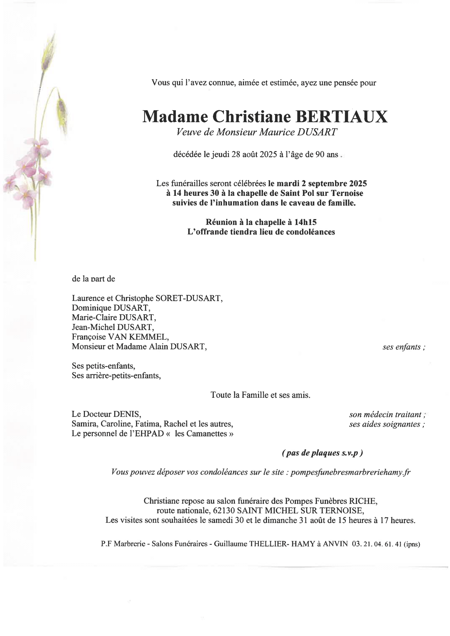 Chère famille, chers amis, C’est avec une grande tristesse que nous vous annonçons le décès de Christiane survenu le jeudi 28 août 2025