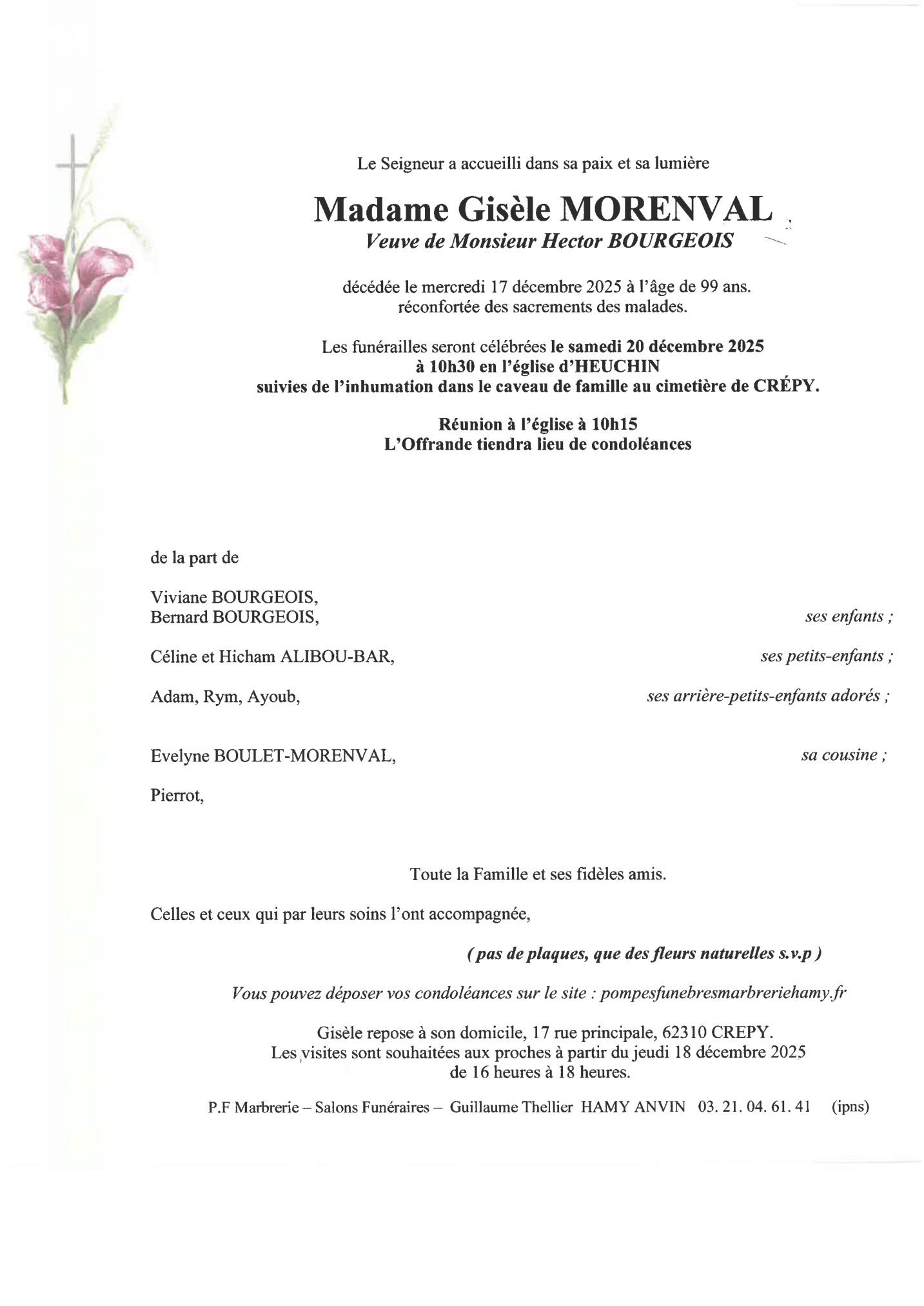 Chère famille, chers amis, C’est avec une grande tristesse que nous vous annonçons le décès de Gisèle survenu le mercredi 17 décembre 2025