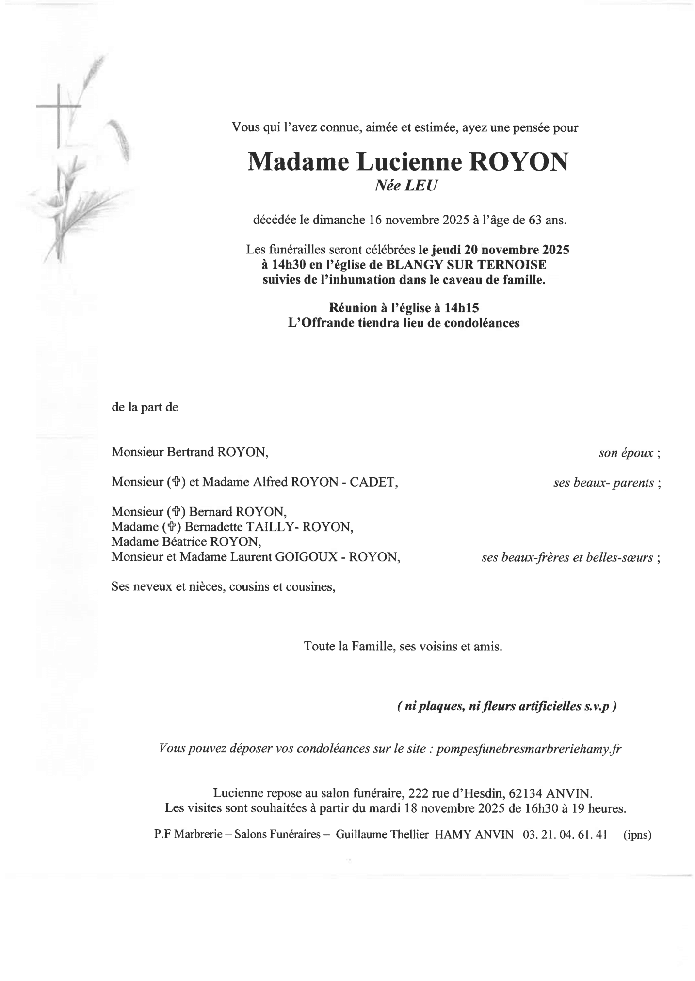 Chère famille, chers amis, C’est avec une grande tristesse que nous vous annonçons le décès de Lucienne survenu le dimanche 16 novembre 2025