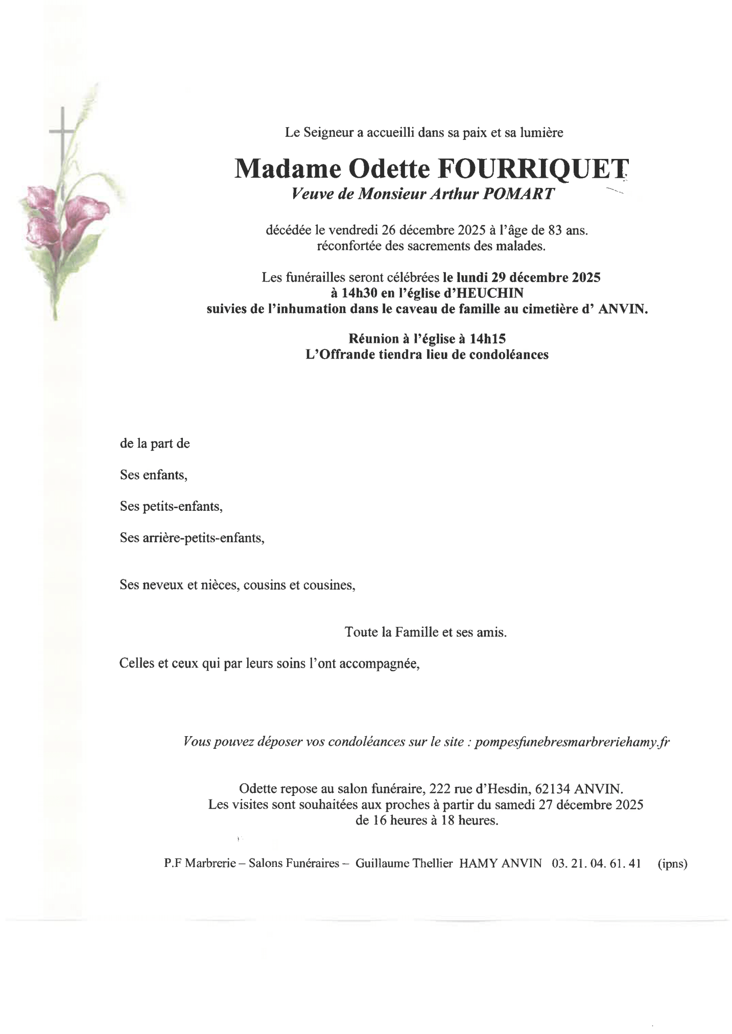 Chère famille, chers amis, C’est avec une grande tristesse que nous vous annonçons le décès de Odette survenu le vendredi 26 décembre 2025