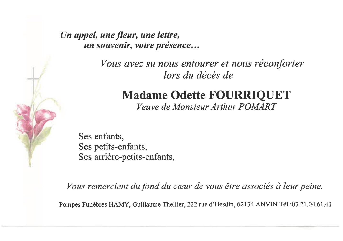 Du fond du cœur, nous vous disons merci. A vous qui, par votre présence, vos fleurs, vos pensées, et par vos écrits réconfortants avez voulu témoigner votre soutien, votre amitié ou votre affection, lors du décès de Madame Odette POMART née FOURRIQUET