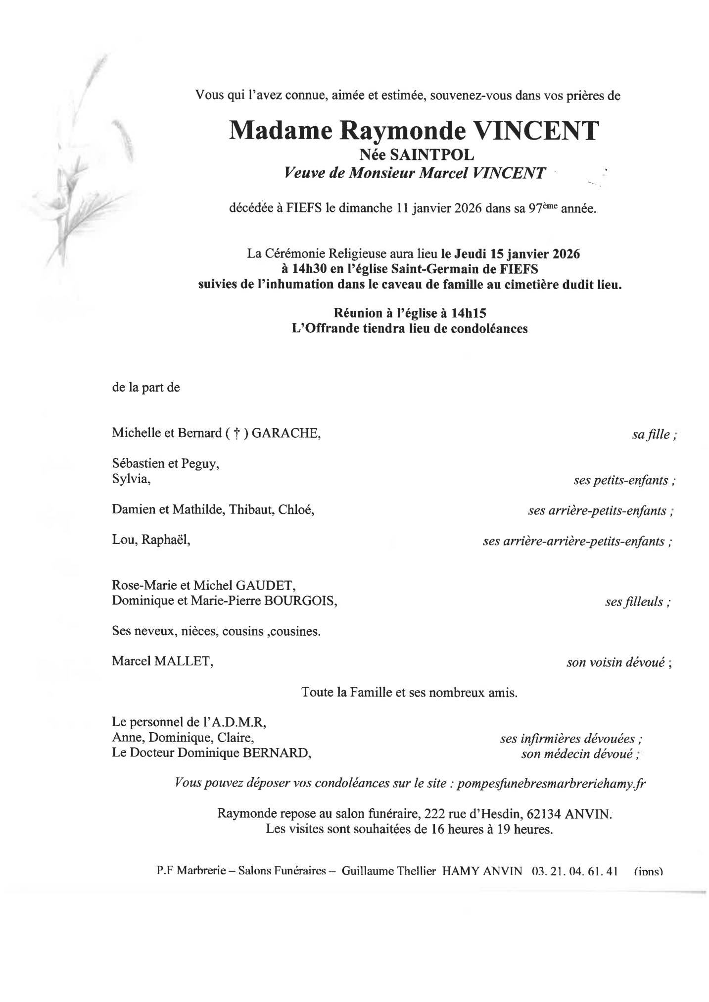 Chère famille, chers amis, C’est avec une grande tristesse que nous vous annonçons le décès de Raymonde survenu le dimanche 11 janvier 2026