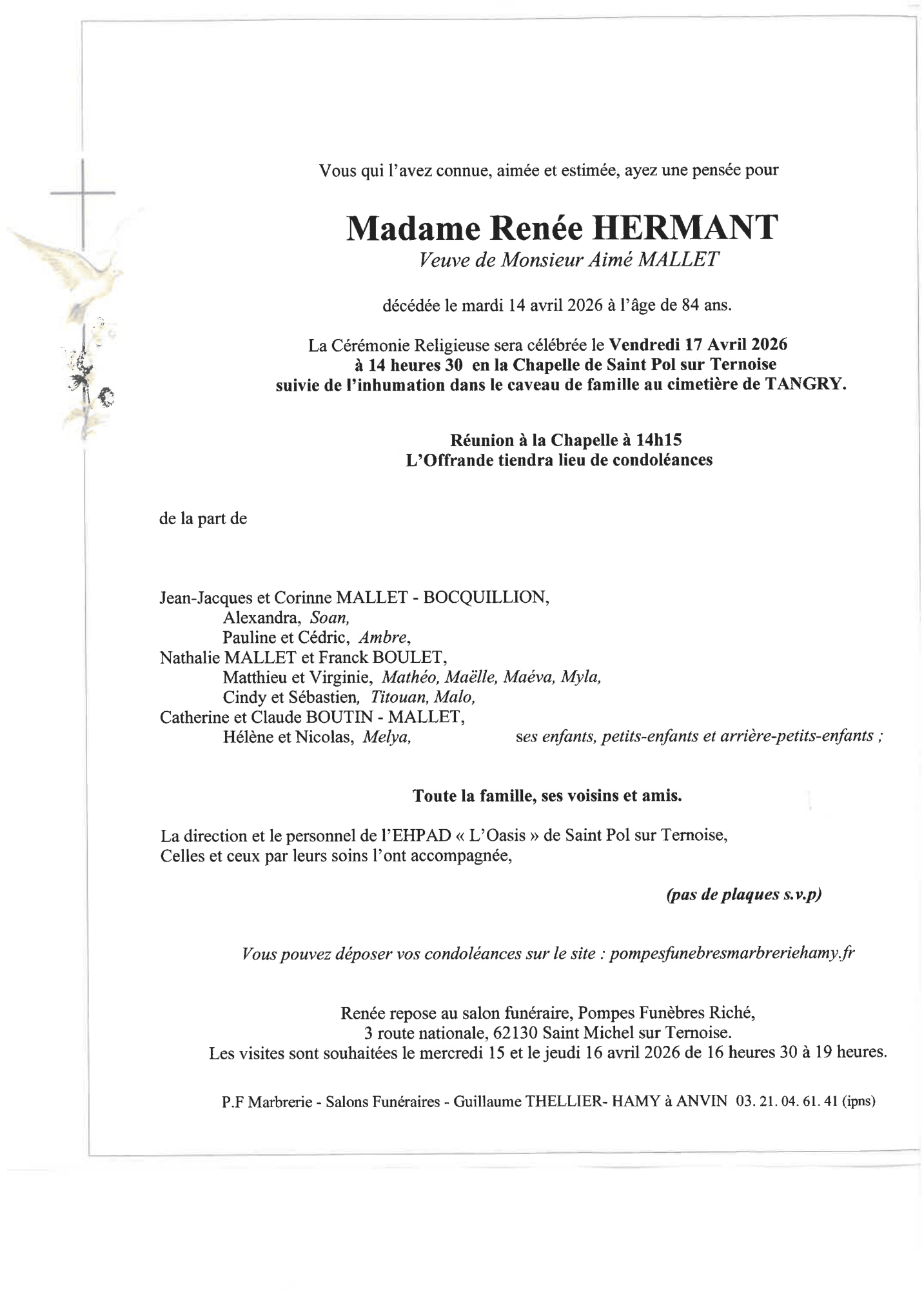 Chère famille, chers amis, C’est avec une grande tristesse que nous vous annonçons le décès de Renée survenu le mardi 14 avril 2026
