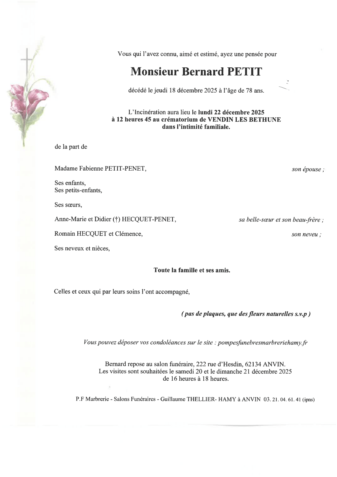 Chère famille, chers amis, C’est avec une grande tristesse que nous vous annonçons le décès de Bernard survenu le jeudi 18 décembre 2025