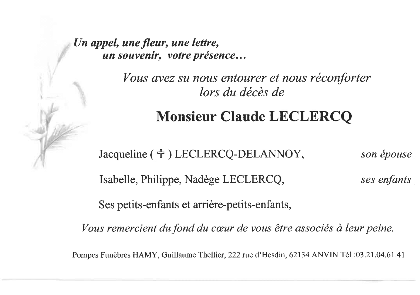 Du fond du cœur, nous vous disons merci. A vous qui, par votre présence, vos fleurs, vos pensées, et par vos écrits réconfortants avez voulu témoigner votre soutien, votre amitié ou votre affection, lors du décès de Monsieur Claude LECLERCQ