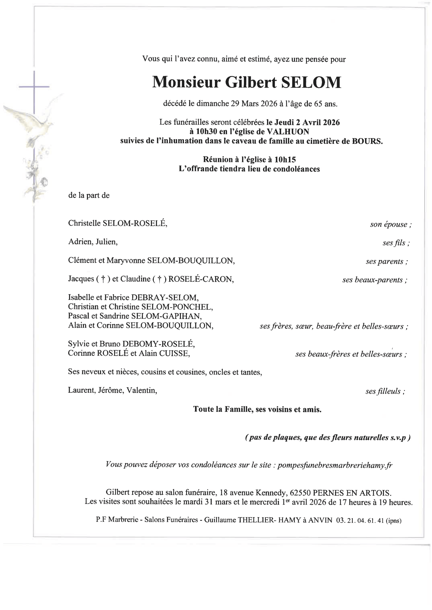 Chère famille, chers amis, C’est avec une grande tristesse que nous vous annonçons le décès de Gilbert survenu le dimanche 29 mars 2026