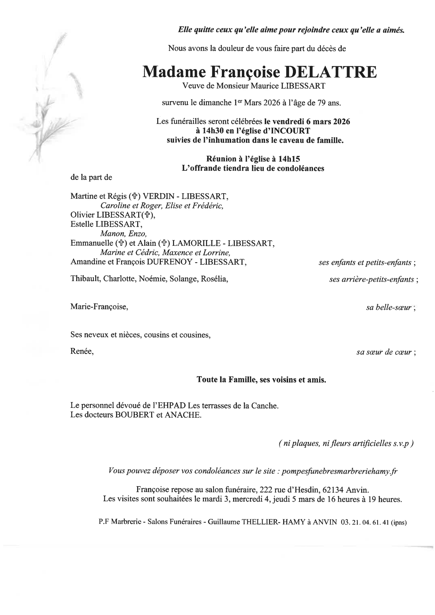 Chère famille, chers amis, C’est avec une grande tristesse que nous vous annonçons le décès de Françoise survenu le dimanche 1er mars 2026