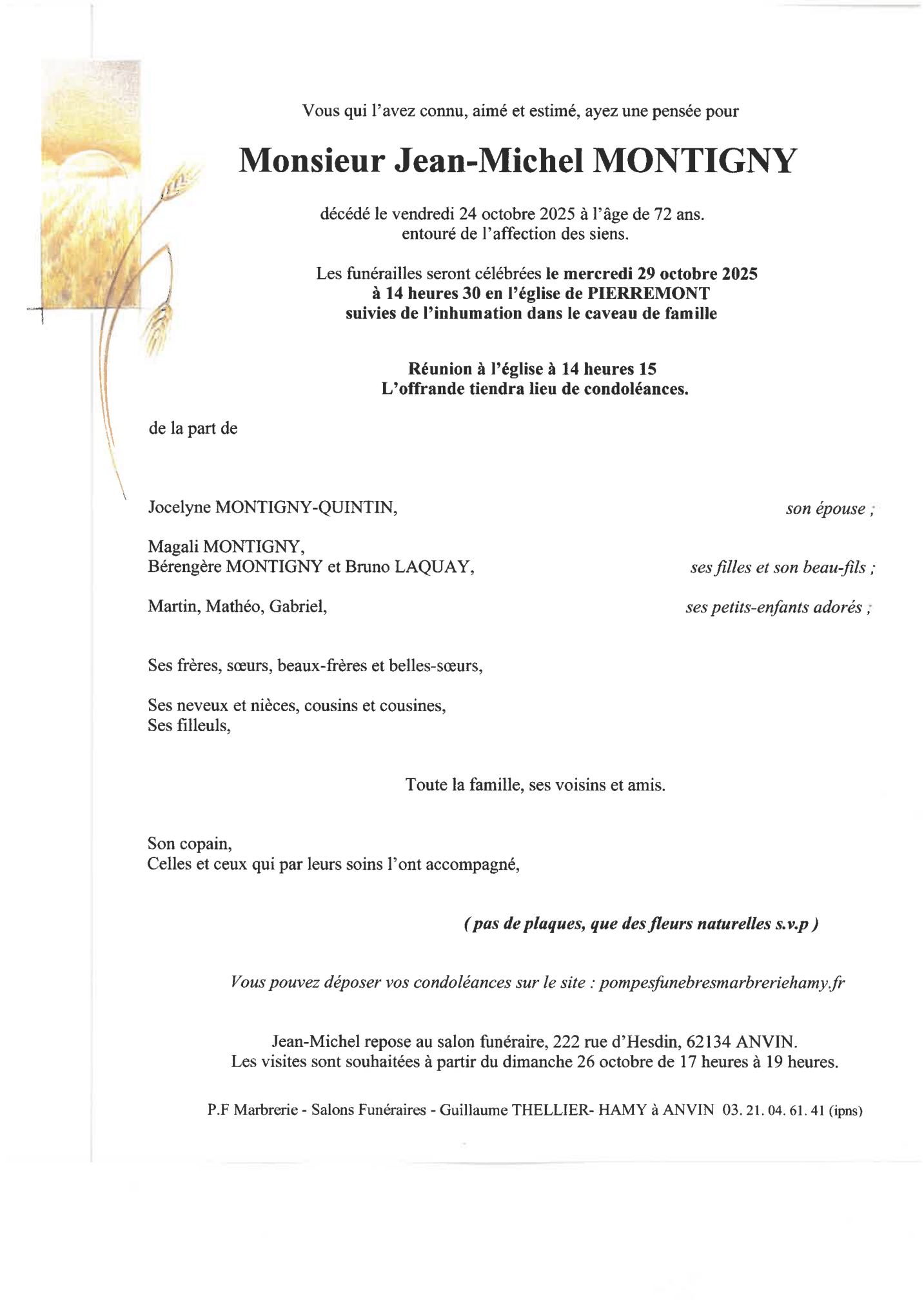 Chère famille, chers amis, C’est avec une grande tristesse que nous vous annonçons le décès de Jean-Michel survenu le vendredi 24 octobre 2025