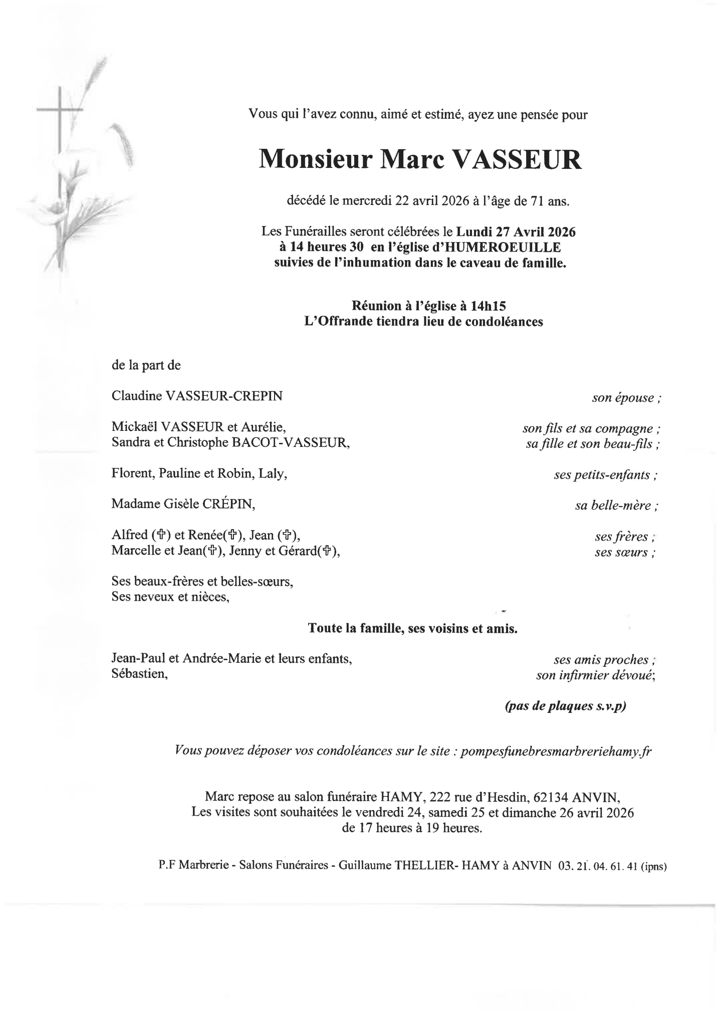 Chère famille, chers amis, C’est avec une grande tristesse que nous vous annonçons le décès de Marc survenu le mercredi 22 avril 2026