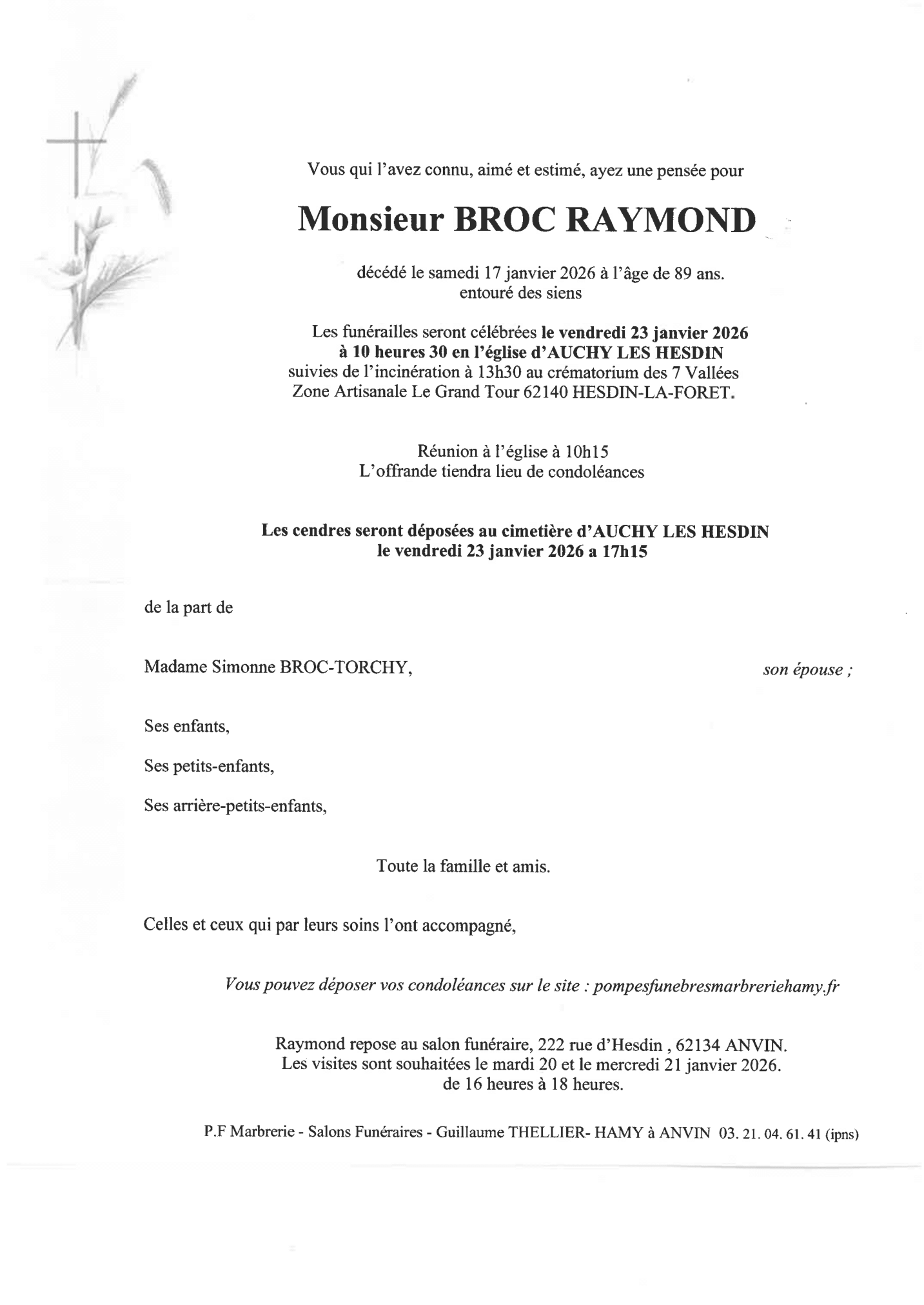 Chère famille, chers amis, C’est avec une grande tristesse que nous vous annonçons le décès de Raymond survenu le samedi 17 janvier 2026