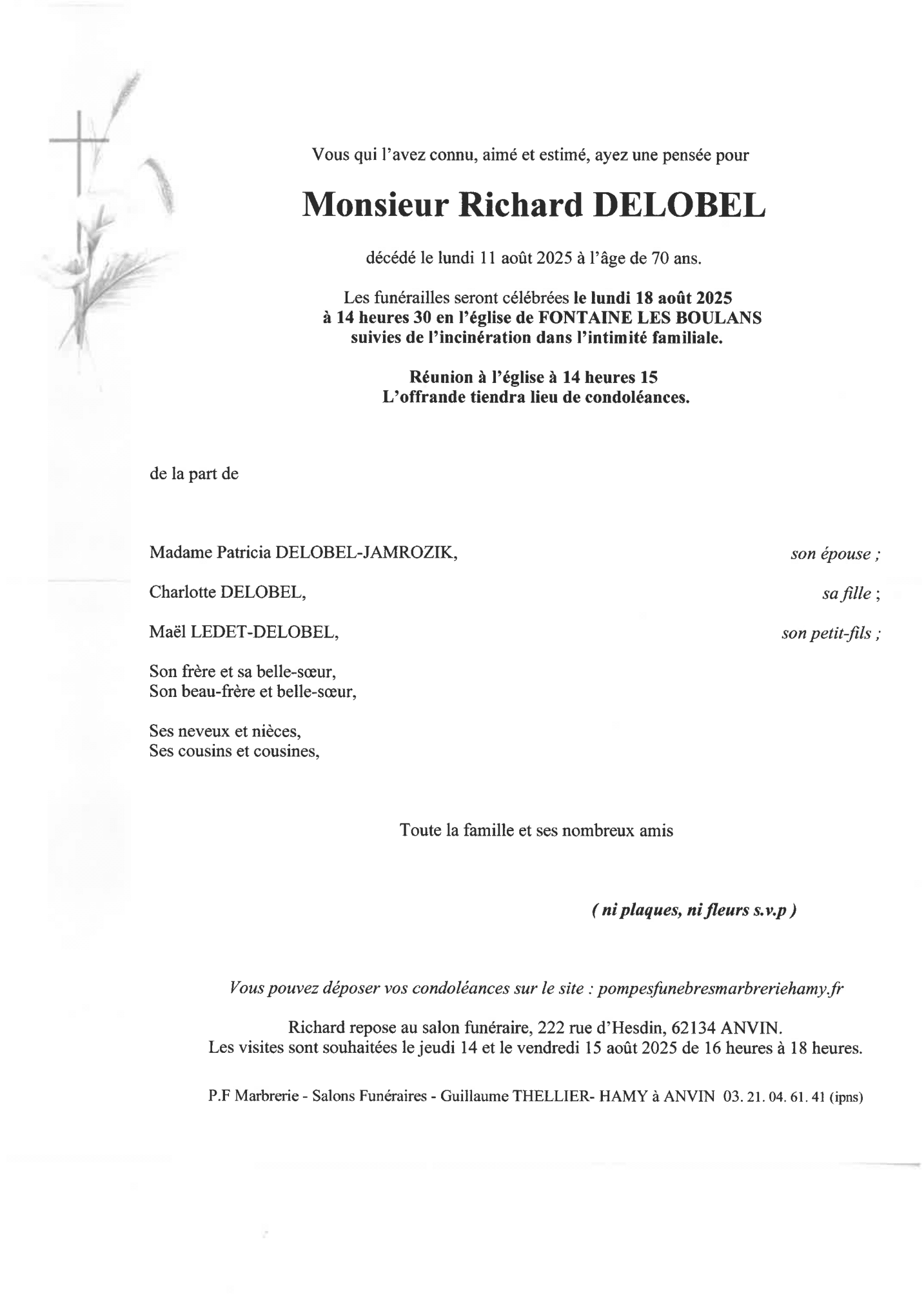 Chère famille, chers amis, C’est avec une grande tristesse que nous vous annonçons le décès de Richard survenu le lundi 11 août  2025