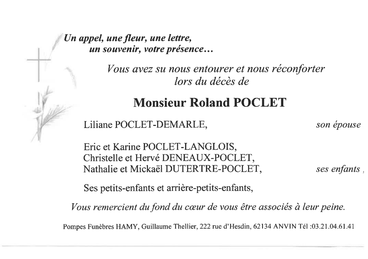 Du fond du cœur, nous vous disons merci. A vous qui, par votre présence, vos fleurs, vos pensées, et par vos écrits réconfortants avez voulu témoigner votre soutien, votre amitié ou votre affection, lors du décès de Monsieur Roland POCLET